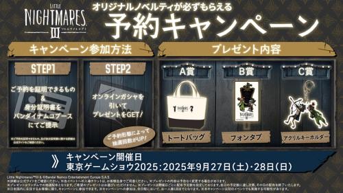 株式会社バンダイナムコエンターテインメントは、サスペンスアドベンチャーゲーム『リトルナイトメア3』を2025年10月10日にNintendo Switch 2、Nintendo Switch、PlayStation5、PlayStation4、Xbox Series X|S、Xbox One、PCデジタル版で発売する。9月17日より、各プラットフォームのデジタルストアで無料体験版の配信を開始した。