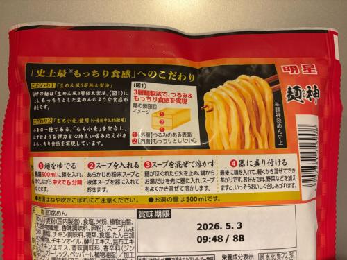 まずは麺の太さと形状が只者ではない。「生めん風3層麺製法」といってつるみのある表面の外層と、もっちりとした中心の内層に分けて作られている。そして、小麦粉の5.3%に「もち小麦」を使っているのがポイントだ。もち小麦は人気ラーメン店が極太の手打ち麺で使って大ブレイクした小麦。これをインスタント麺に採用するとは凄い。