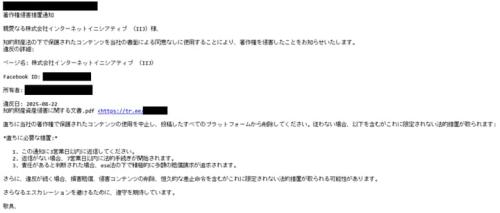 ・メール件名の例は「著作権で保護されたメディアの無許可使用の通知」や「知的財産所有権違反通知 Fanpage 株式会社インターネットイニシアティブ(IIJ)」など