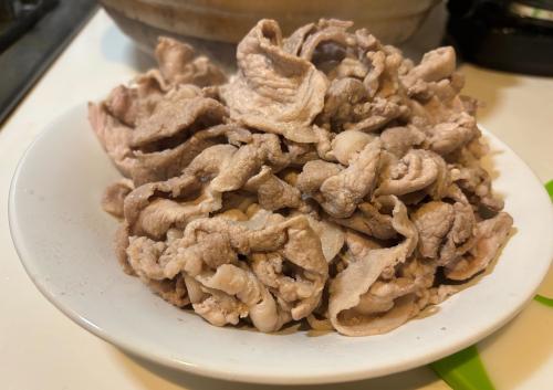 鍋にスープを入れて火にかけ、沸騰したら野菜を入れ、その後、焼いた豚肉とその他の具材を煮込んだら出来上がりだ。袋の内側にラードが固まってくっついているが、捨てずにしっかり絞って入れよう。