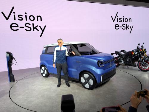 スズキのブースでは、軽自動車クラスのBEV(バッテリー式電気自動車)のコンセプトモデル「Vision e-Sky」が世界初公開されています。