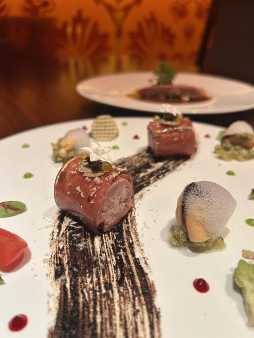●海老しんじょを纏った近江鴨のロースト コリアンダーオイルとこぶみかん香るジュ