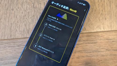 イヤホンとしての機能も充実。ハイレゾ音源の再生に対応し、LHDC対応のスマートフォンであれば最大24bit/96kHzの高音質で再生ができます。手持ちのPixel 10では、24bit/48kHzのUltra HD音質でAmazon Musicの再生ができることを確認しています。