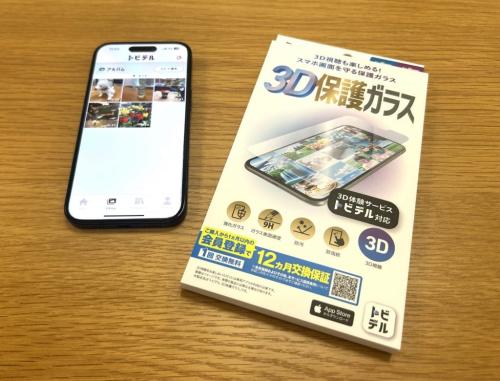スマホには専用保護ガラスを貼って「トビデル」アプリをダウンロード。今回は、あらかじめ設定したものを使用しました。専用保護ガラスは普通の保護フィルムと同じように使えます。3Dを使わないときでも問題なし。