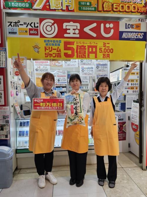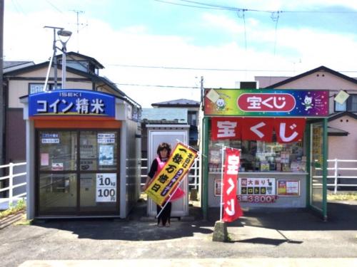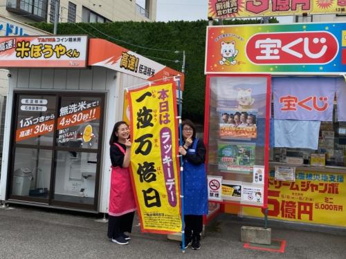 お隣が精米所の売り場。2009年にドリームジャンボ宝くじで2等1億円、2013年にロト6で1等1億4千万円、2023年にロト6で1等3億3千万円と大当たりが続出しています。