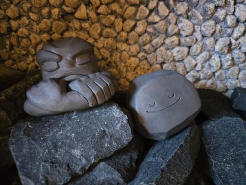 こだわりのフォトスポットはイシツブテと「いしにへんしん寝」のメタモンのサウナストーン。サウナ内にもこのイシツブテとメタモンが出現しており、ロウリュの際は「イシツブテは水が苦手な子なので、メタモンだけに水をかけます」とのこと。