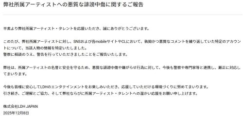 LDH公式は「弊社所属アーティストへの悪質な誹謗中傷に関するご報告」と題し、「平素より弊社所属アーティスト・タレントを応援いただき、誠にありがとうございます。このたび、弊社所属アーティストに対し、SNSおよび各mobileサイトやCLにおいて、執拗かつ悪質なコメントを繰り返していた特定のアカウントについて、当該人物の情報を特定いたしました。警察に相談のうえ、警告を行っていただきましたことをご報告いたします」と伝えた。