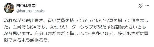 はる奈さんは「恐れながら選出頂き、青い薔薇を持ってかっこいい写真を撮って頂きました」と報告した上で、青いバラを持つ写真を公開。「五常でもISAでも、女性のリーダーシップが果たす役割は大きいと心から思います。自分はまだまだで悔しいことも多いけど、投げ出さずに貢献できるよう頑張ろう」とつづった。
