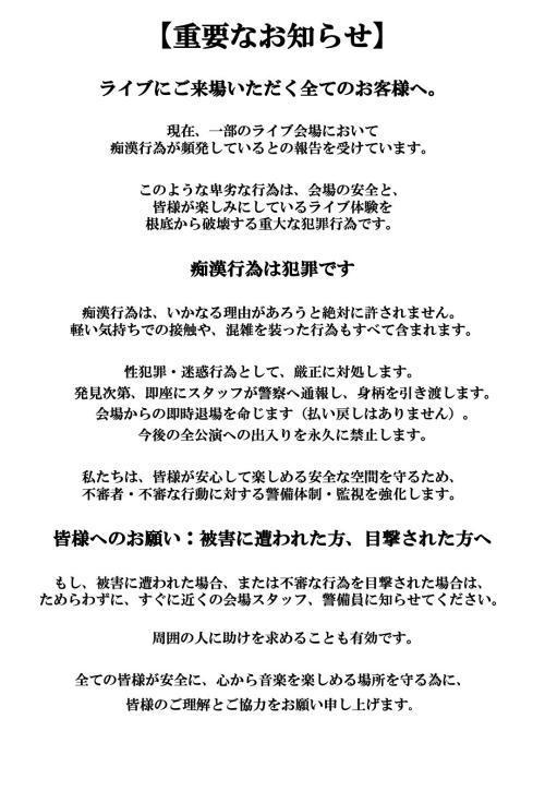 「このような卑劣な行為は、会場の安全と、皆様が楽しみにしているライブ体験を根底から破壊する重大な犯罪行為です。痴漢行為は犯罪です 痴漢行為は、いかなる理由があろうと絶対に許されません。軽い気持ちでの接触や、混雑を装った行為もすべて含まれます」と説明した。