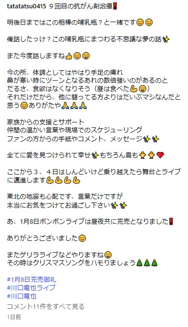 がん闘病中のミュージカル俳優川口竜也(58)が12日までにインスタグラムを更新。9回目の抗がん剤治療が始まったことを報告した。