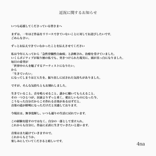 シンガー・ソングライター4na(シーナ)が13日までに自身のX(旧ツイッター)を更新。「急性骨髄性白血病」が寛解したと明かした。