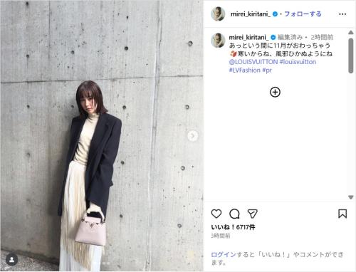 桐谷は「あっという間に11月がおわっちゃう 寒いからね、風邪ひかぬようにね」と、ルイ・ヴィトンの公式アカウントを添えて、写真を投稿。黒のジャケットにベージュのタートルネック、白のロングスカート、ハンドバッグを合わせたお洒落なコーディネートを披露した。