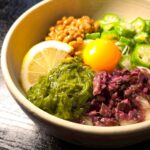 めがぶ、卵黄を乗せレモンを添えて仕上げにごま油