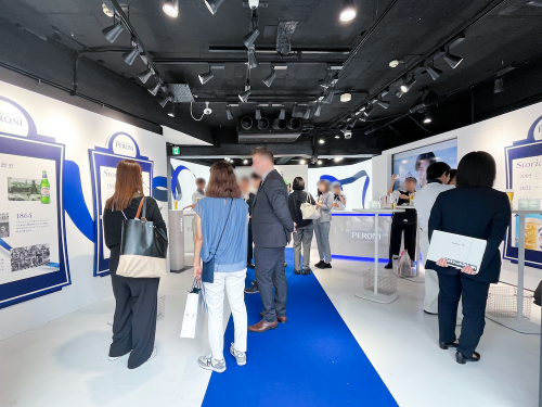 クルージング船をイメージした会場は、「ペローニ」のブランドカラーである白とブルーを基調にした爽やかな空間で、一歩踏み入れた瞬間から地中海の空気感に一気に引き込まれます。
