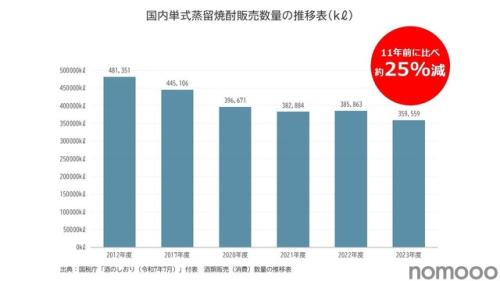 近年、国内の単式蒸留焼酎の販売量は減少傾向にあり、2023年の販売量は2012年比で約25%減少しています。これまで中高年層のファンに支えられてきた黒糖焼酎ですが、「焼酎は年配の人が飲むお酒」というイメージを払拭し、次世代にその魅力と文化を伝えるための新たな挑戦が求められていました。