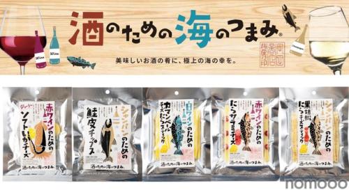 「酒のための海のつまみ®」シリーズの第4弾は、「赤ワインのためのジューシーソフトいかチーズ」「シャンパンのための鮭皮チップス」「白ワインのためのカマンベールチーズたらスティック」「赤ワインのためのたらサラミチーズ」「シャンパンのための黒胡椒たらチーズスティック」の5種類です。