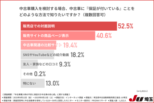 中古車購入を検討する際、「保証が付いている」ことを知る手段として最も多かったのは「販売店での対面説明」で52.5%に上った。直接スタッフから説明を受けられる安心感は依然として大きく、信頼できる情報源として評価されている。次いで「販売サイトの商品ページ表示」が40.6%と多く、オンライン上での事前確認ニーズも強い。