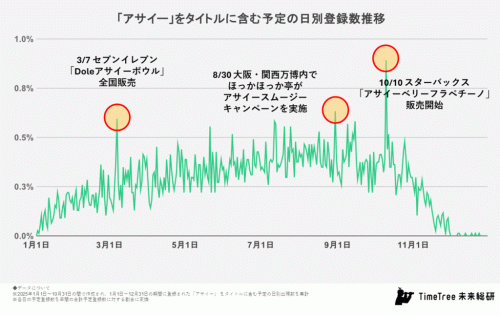 フード部門で1位となったのは「アサイー」。第一次ブームから約10年前が経過した現在、再び第二次ブームが訪れている「アサイー」は高い栄養価と美容効果からZ世代を中心に人気が高まり、今回ランクインする結果となった。日別登録数の推移を見ると、年始からじわじわと予定数が増加していき、セブンイレブンやスターバックスなどで「アサイー」関連の商品が発売されるタイミングで大きく予定登録が増えていたことが読み取れた。