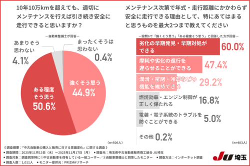 市場の変化を感じつつも、明確な答えがつかめないまま迷ってしまう人は少なくないはずだ。中古車の“寿命”に対する共通認識は、果たして今どこまでアップデートされているのか。そこで今回、埼玉県中古自動車販売商工組合 JU埼玉(https://ju-saitama.com/)は、中古自動車を保有している一般ユーザーと自動車整備士を対象に、「中古自動車の購入と販売に対する意識変化」に関する調査を実施した。