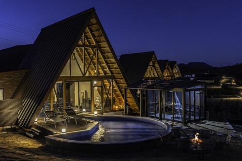 23棟のうち4棟限定のヴィラタイプ。三角屋根が特徴的で、プライベートプールを完備。寝室が1階と2階に分かれており、2世帯やグループでの利用にも適している。バルミューダ製の家電を備えるなど、別荘のような居心地の良さを実現した。