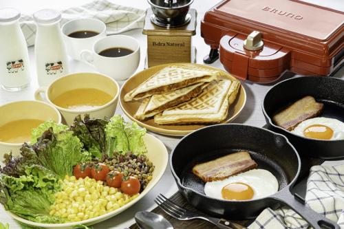 朝食は、和食(ご飯、豚汁、納豆など)または洋食(ホットサンド、プルドポークなど)から選択可能。富士山の清々しい空気の中でとる朝食は、格別の味わいだ。