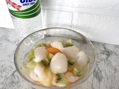 お好みのフルーツと一緒にサイダーを注いでフルーツポンチにすれば、お子様が大喜びするおやつの完成。手軽に美味しいライチをたっぷり満喫できる、おすすめの一品です。