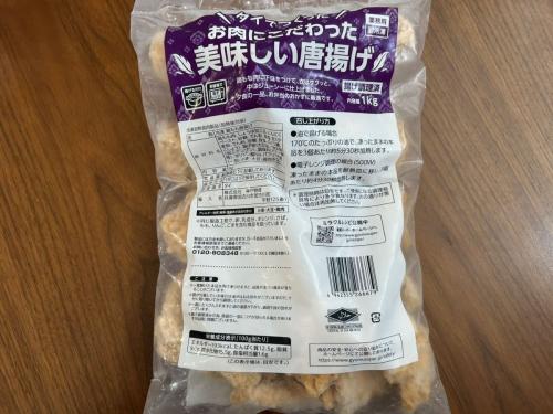 1kgという巨大な袋に入った、鶏もも肉のからあげ。下味付きで、外はサクッと中はジューシーな一品です。