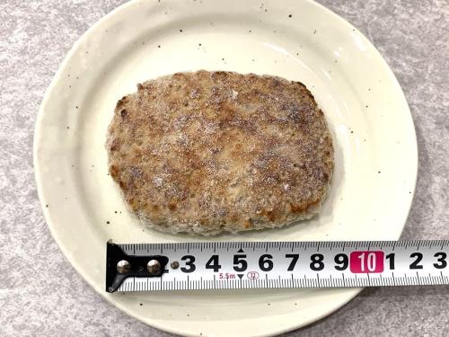 オーストラリア産牛肉とアメリカ産豚肉を使い、約9cmの手のひらサイズで、食卓のメインを張れるボリューム感です。