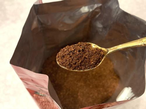袋を開封してみると、極深煎りらしい濃いブラウン色のコーヒー粉が!パッと見ただけでも香ばしいアロマやコクをイメージさせます!