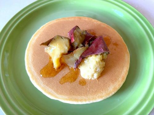 しっかり解凍すると柔らかく、パンに塗ってもおいしい紅天使焼きいもはパンケーキにのせても◎。