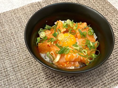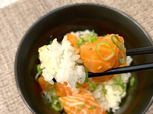 今回は熱々のご飯にサーモンポキ・生卵・ねぎを乗せた丼ぶりを作ってみました。
