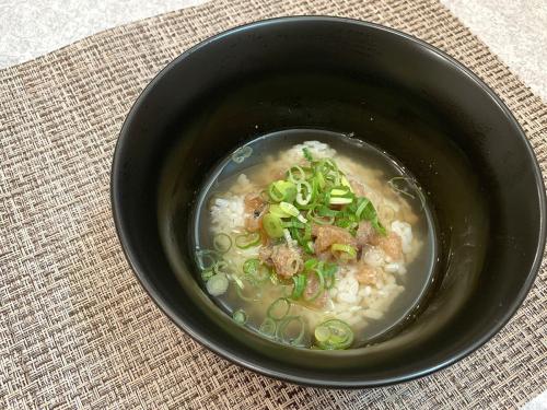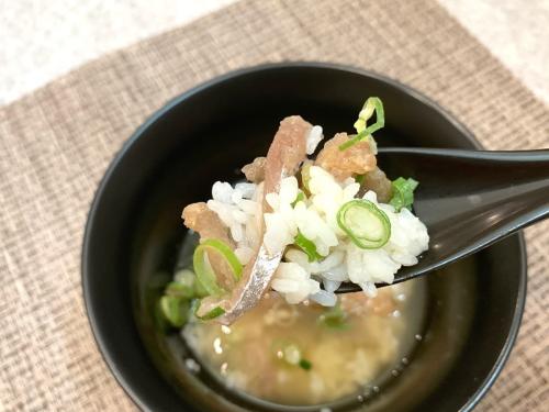 熱々のお茶と出汁が組み合わさって、体がホッとするやさしい味わいに♪さらに、鯵のなめろうの旨味が溶け出したスープがご飯全体に行き渡り、一気に飲み干したくなるような美味しさです!