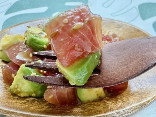 次に、ハワイ風にアレンジしたアボカドマグロポキを作りました。マグロと同程度の大きさにカットしたアボカドを、わさび醤油ダレで一緒に和えるのみ!