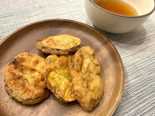 衣の香ばしさとともに、さつまいも本来の甘みもしっかりと感じられます。天つゆに付ければ、つゆの塩気と旨味がさつまいもの甘さと見事に調和し、上品な和食の味わいに。
