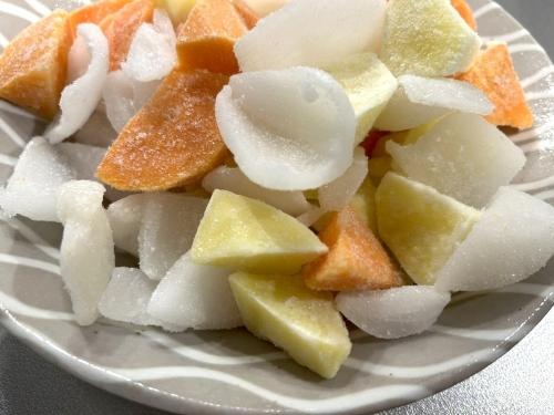 カレーの定番野菜である、たまねぎ・じゃがいも・にんじんの3種類が、すでに一口大にカットされ、軽く湯通しされた状態で冷凍されています。