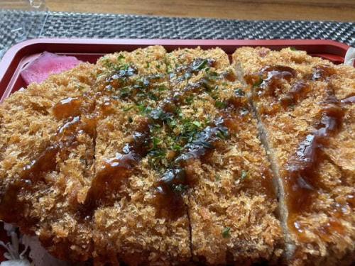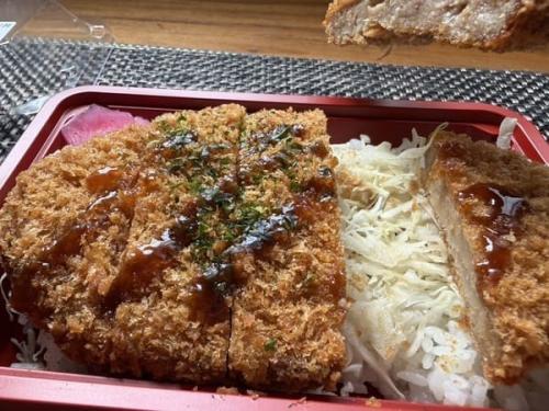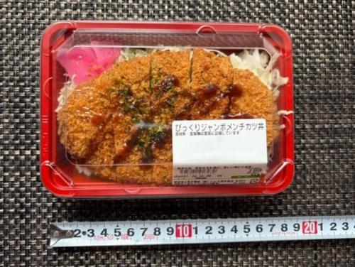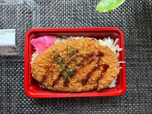 ラ・ムーの「びっくりジャンボメンチカツ丼」は大きなメンチカツがドーンと乗ったボリューム弁当。
