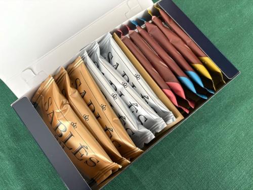 内容量:合計12枚(サブレ・オ・ショコラ(ミルク/スイート)各3枚、パイショコラ(アーモンド/コーヒー/ごま)各2枚)