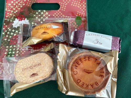内容量:マドレーヌ1個、シャトー・レザン1個、ベイクドチーズタルト1個、ダックワーズ1個