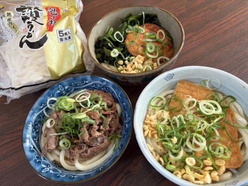 肉うどん、きつねうどん、わかめ&ごぼうあげうどんです。