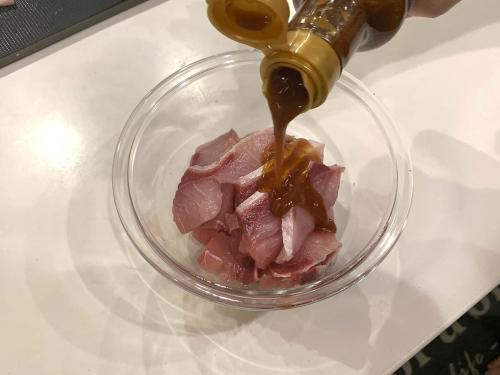 次に、カットしたぶりを市販の漬けだれで味付けしてみました。醤油でも十分美味しすぎるぶりですが、味を変えたいときや味に深みを持たせたいときにおすすめ!