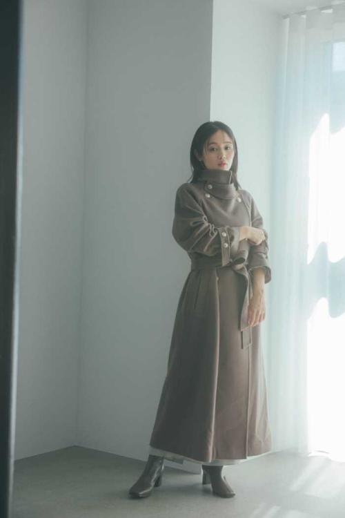 ウールカシミヤスタンドカラーコート ¥49,500は、柔らかなビーバー加工生地を使用。