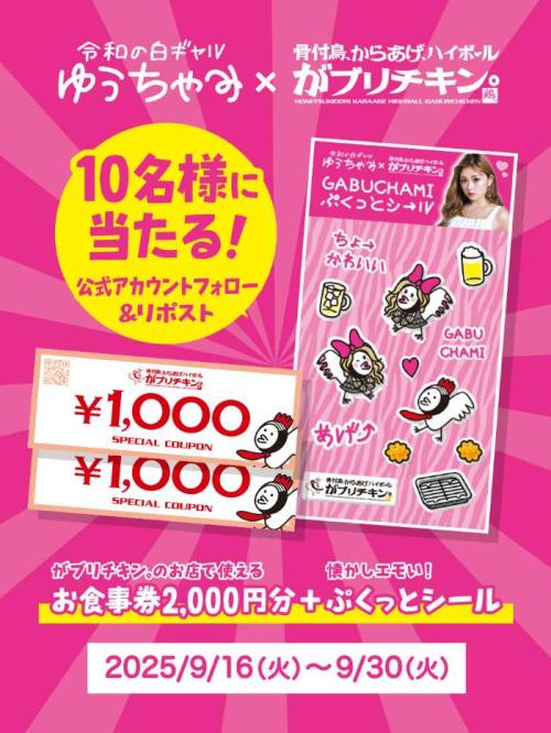 からあげ酒場「がブリチキン。」とタレント・ゆうちゃみさんの本気コラボ第2弾が、2025年9月16日(火)より全国47店舗でスタート!前回大好評だったラインナップに加え、「トムヤムクンからあげ⤴」や「理想のポテサラ」など新メニューが仲間入り。さらにオリジナルキャラクター「がブちゃみ」の限定グッズも登場し、食べても遊んでも楽しめる企画になっています♪