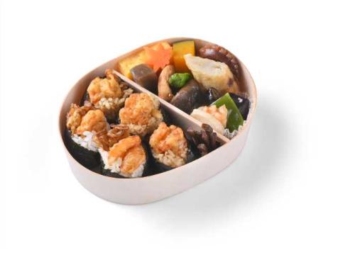 〈地雷也〉と〈錦松梅〉のコラボは、風味豊かなふりかけを混ぜ込んだ天むすと舞茸天むすを詰め合わせた「秋の錦松梅天むす弁当」(各日10点限り/1折1,361円)。