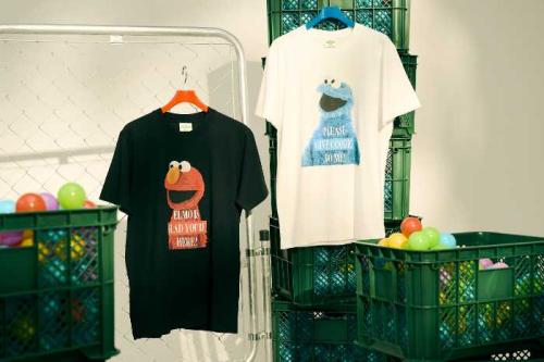 Tシャツには「ELMO IS GLAD YOU’RE HERE!」や「PLEASE GIVE COOKIE TO ME!」といったキャラクターらしいフレーズが添えられ、思わず笑顔になるデザインに仕上がっています。