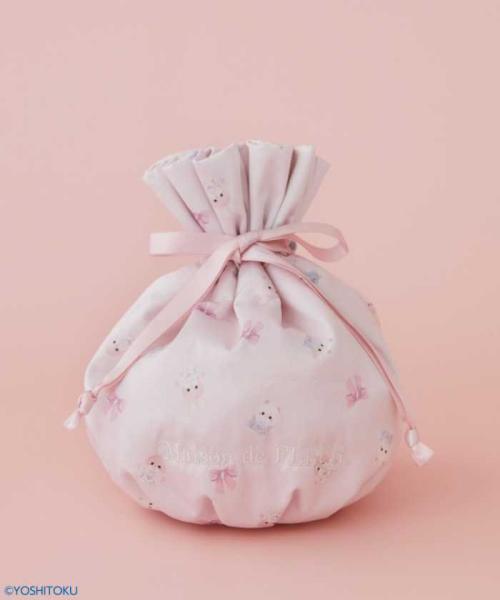 サテン素材の巾着ポーチ(税込4,700円)は同柄プリントで揃えられ、持ち歩きにぴったり。