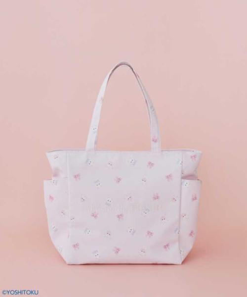 サイドポケットトート(税込8,800円)にはキャラクターとリボンを組み合わせた総柄プリントを採用し、実用性と可愛さを兼ね備えています。
