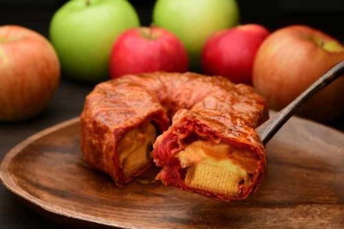 「アップルパイバウム」は、サクサク食感のパイ、しっとりとしたバウムクーヘン、蜜を含んだりんごの三重奏。