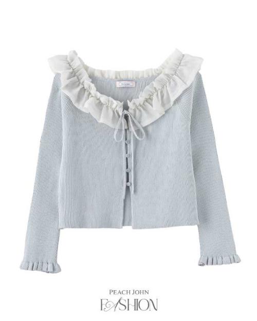 「フリルカラーニットトップス」(8,800円/ワンサイズ/グレー・ベージュ・ブラック)はオーガンジーフリルが華やかで、ショート丈がスタイルアップを叶えます。