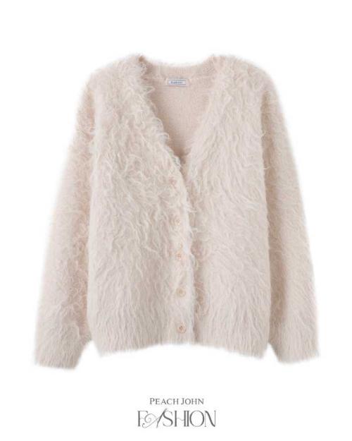 「シャギールーズニットカーディガン」(8,800円/ワンサイズ/ピンク・グレー・モカ)は、長い毛足が冬らしい存在感を放ちつつ、シンプルで合わせやすい万能アイテム。