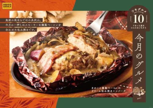 秋の訪れとともに、ココスから「今月のグルメ~10月~」がスタートしました。旨みたっぷりのきのこを使ったメニューは、体も心もほっと温まる味わい。「きのこと燻製ベーコンのクリーム包み焼きハンバーグ」や「舞茸とほうれん草のバターソテー」など、この季節ならではの一皿が揃います。秋の食材とバターのコクが織りなす特別な味わいを、ぜひ楽しんでみてください♪